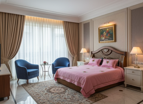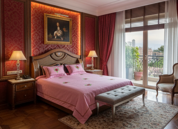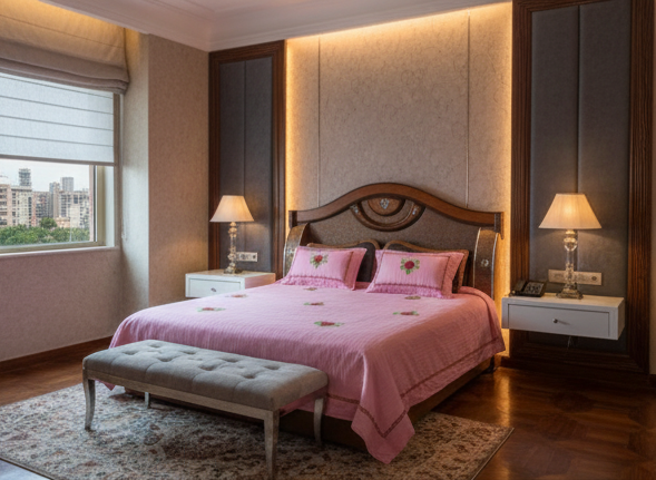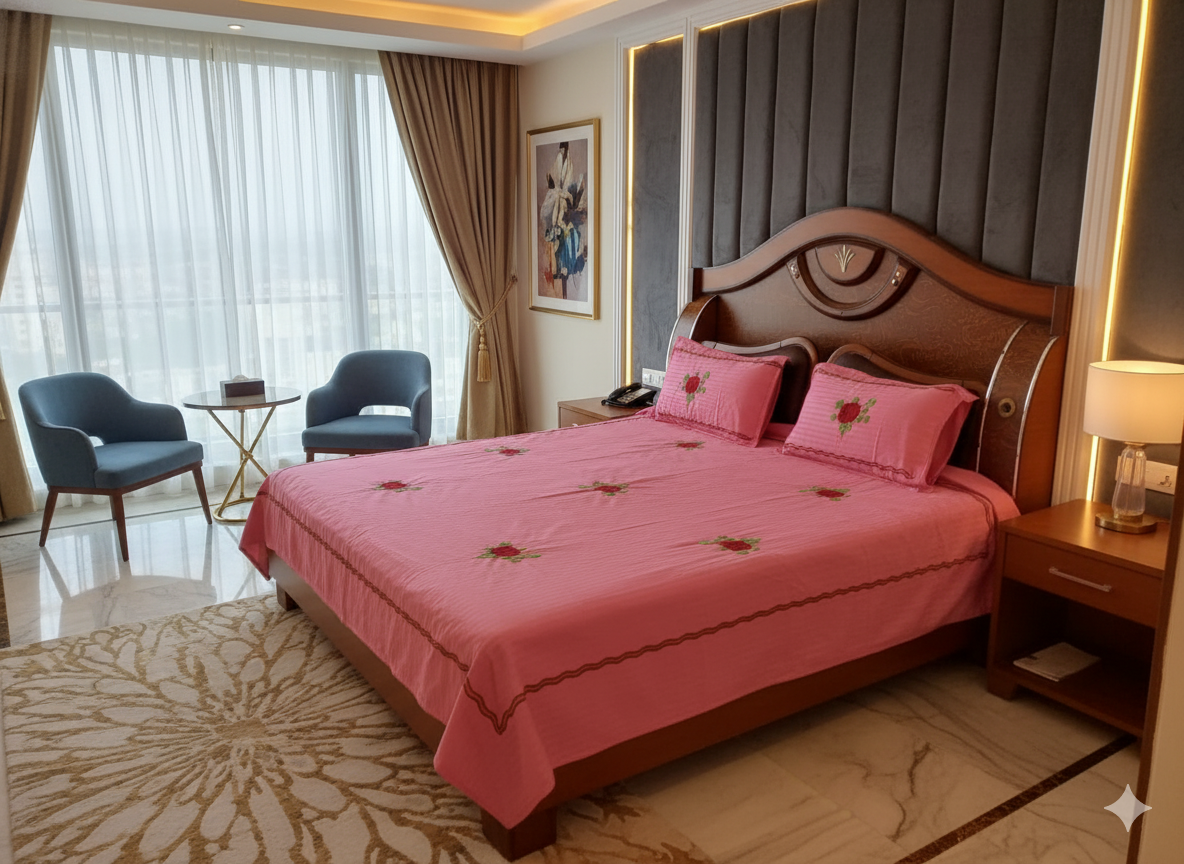 Add a touch of fresh romance & luxury to your bedroom with this premium pink embroidered bedsheet from Deepmaala Textiles.