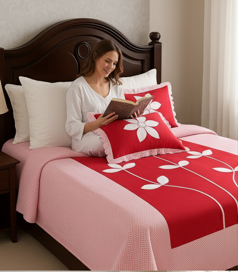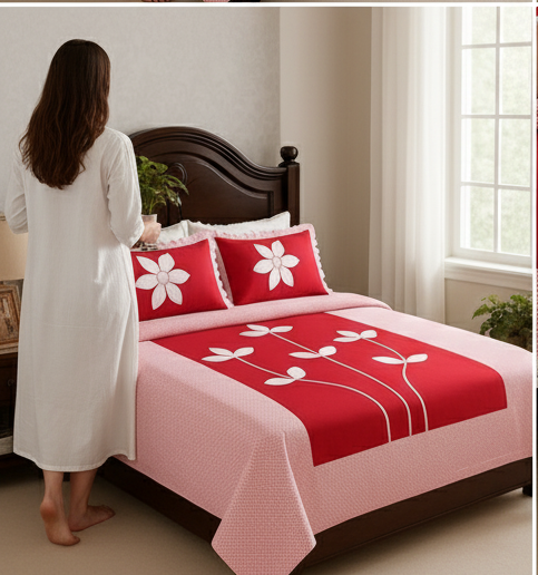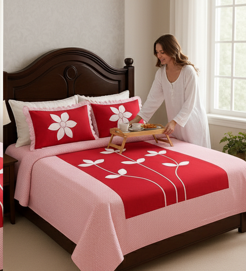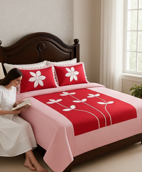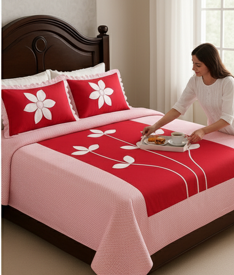 Add a touch of elegance and comfort to your bedroom with this Pure Cotton Floral Bedsheet Set from Deepmaala Textiles. Designed with a striking red and pink color combination, it features modern floral prints that bring a refreshing charm to your space. Crafted from 100% pure cotton fabric, this bedsheet ensures a soft, breathable, and skin-friendly experience for restful sleep. The set includes matching pillow covers for a complete coordinated look — perfect for both everyday use and special occasions.