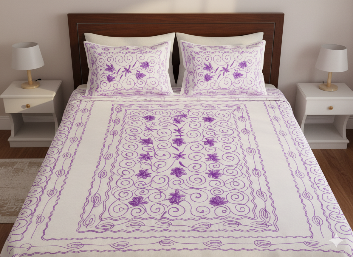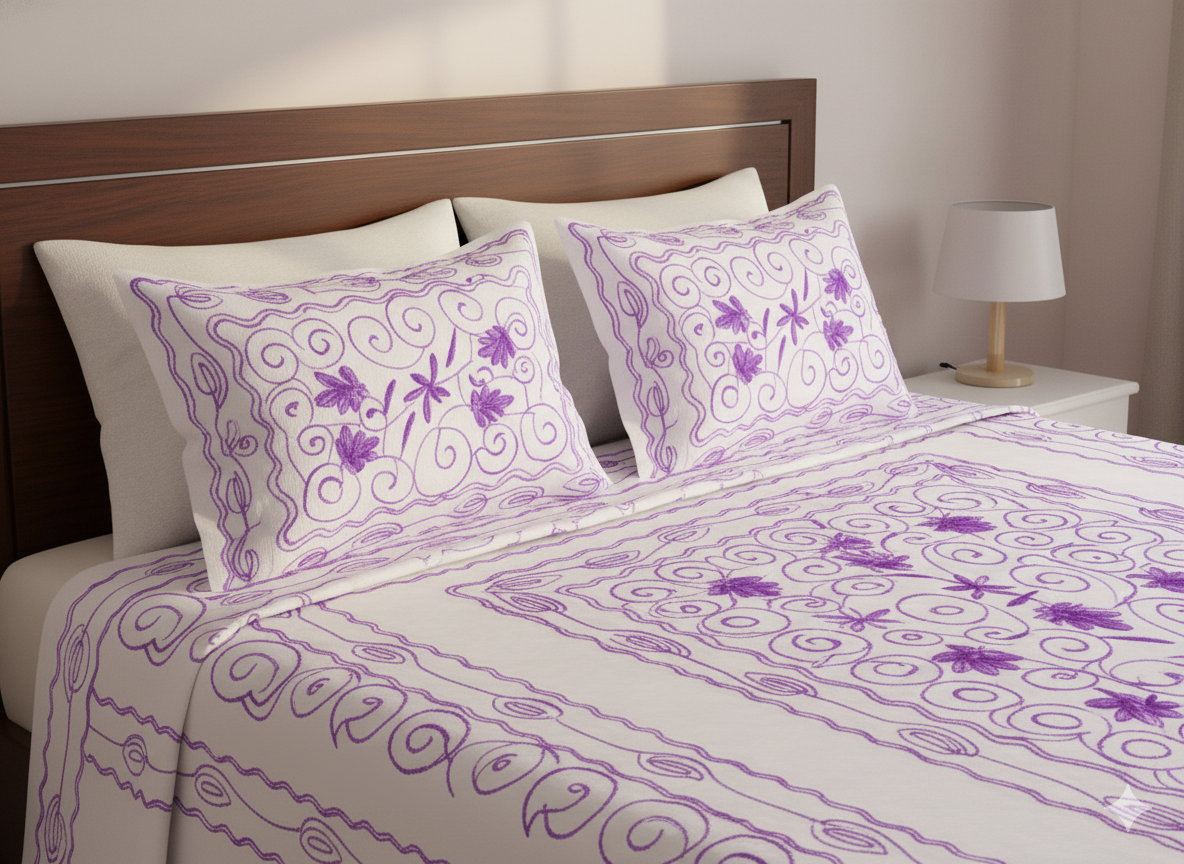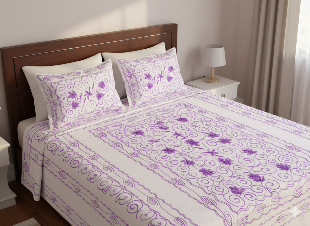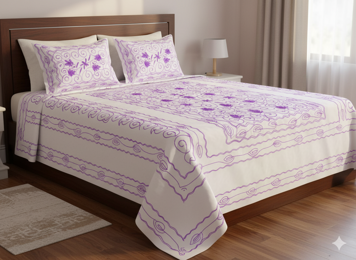 Add a touch of serene elegance to your bedroom with this White & Lavender Embroidered Bedsheet Set from Deepmaala Textiles.